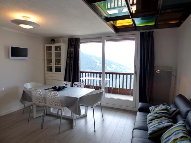 La résidence LA GRANDE OURSE :Vallandry, 1650 m d'altitude, au centre de Vallandry, au dessus de commerces (calmes)Hiver : à 100 m des pistes de ski, du télésiège principal et de la garderie Eté : à 400 m de la forêt, au départ de randonnées sur le versant adret.6 étages avec ascenceur. Casiers à ski. Parking public à 100m.Le logement La Grande Ourse n°43 : Triplex de 55 m² (dont 10 m² en sous pente),Logement soigné, décoration moderne et personnalisée. 5ème étage avec balcon équipé orienté sud ouest. Très belle vue sur la vallée . Niveau de l'entrée :Séjour avec un beau canapé en cuir. Coin salon avec télévision et lecteur dvd intégré, mini-chaîne. Cuisine ouverte avec 3 plaques vitrocéramique, combi four/micro-ondes, lave-vaisselle, réfrigérateur. Bouilloire, grille pain, cafetière.Une salle de bain avec baignoire. WC séparés.A l'étage :1 chambre en sous pente avec un lit double. 1 cabine fermée avec 2 lits superposés (hublot sur l'escalier)une salle d'eau avec douche et lave lingeNiveau + 2 (accès par petits escaliers) : 2 lits simples. véluxCasier à skis.