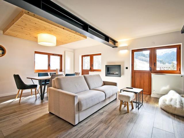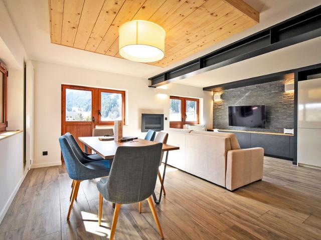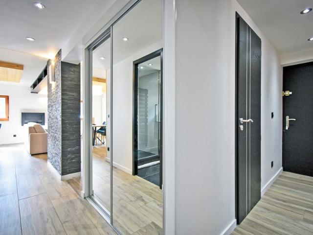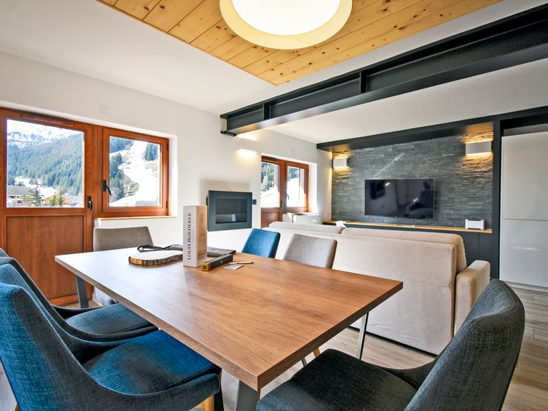 Les nombreuses fenêtres et le balcon inondent l'espace de lumière naturelle tout en offrant une vue panoramique sur les sommets enneigés.