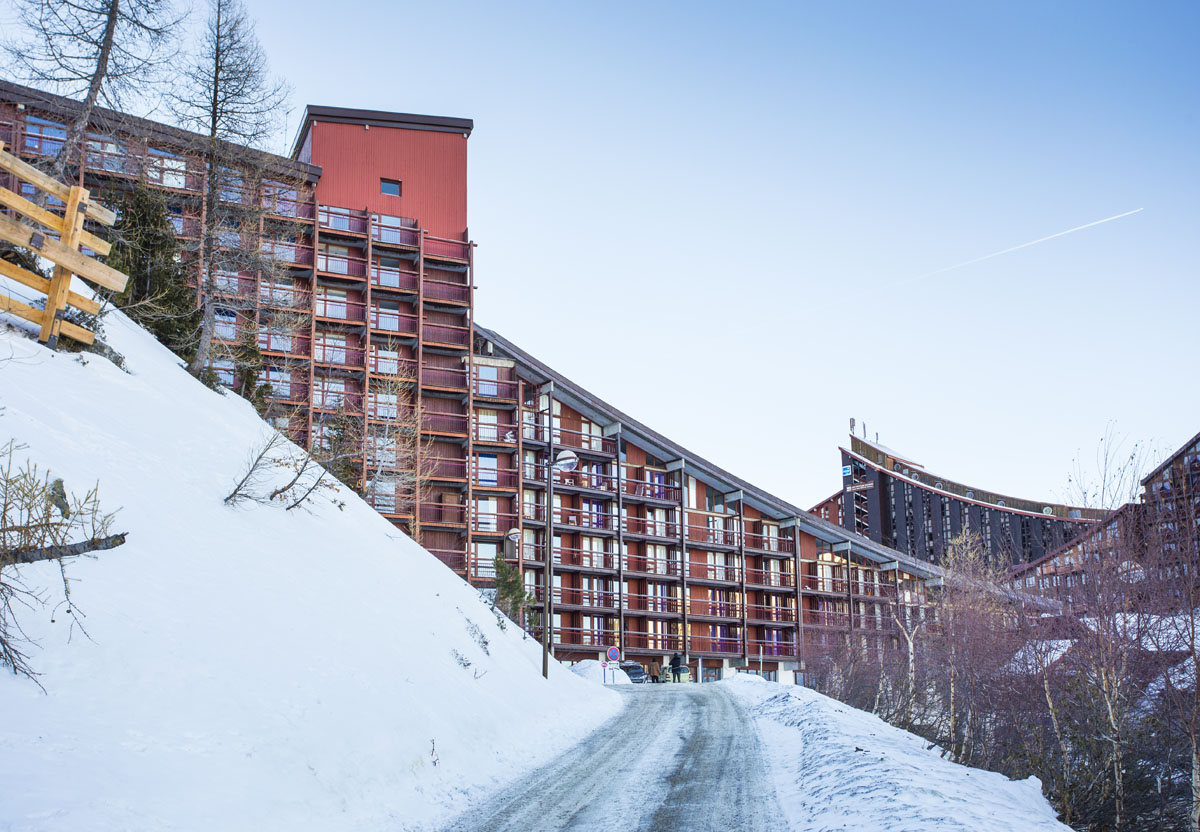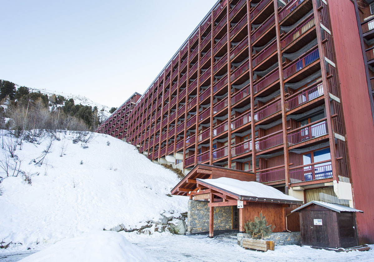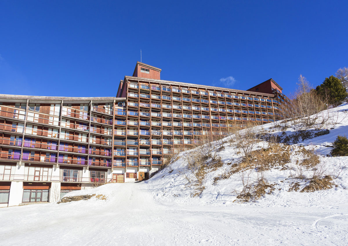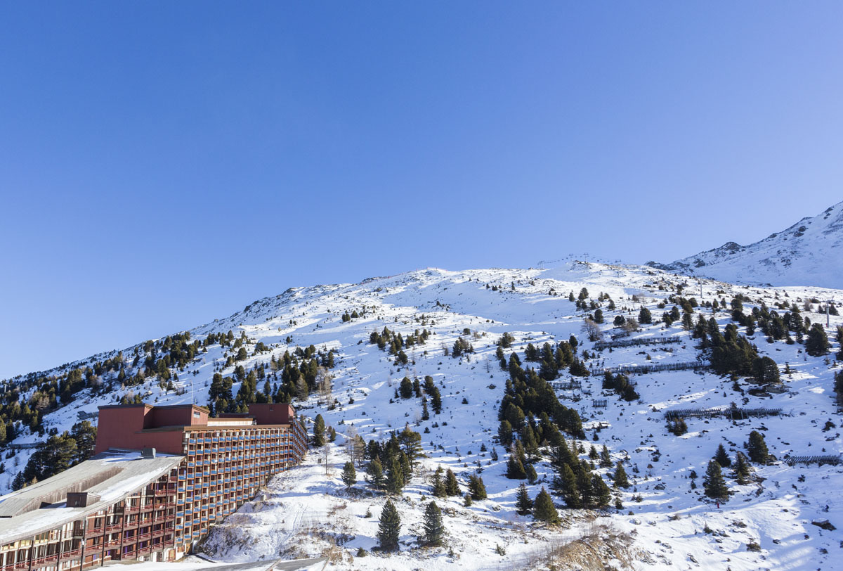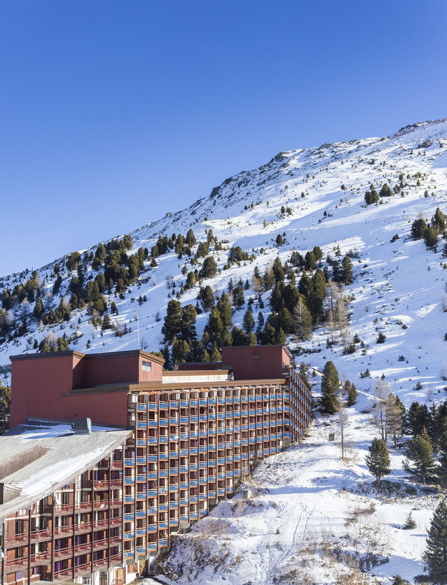 Résidence de 11 étages selon la pente de la montagne, avec ascenseurs et balcons.
