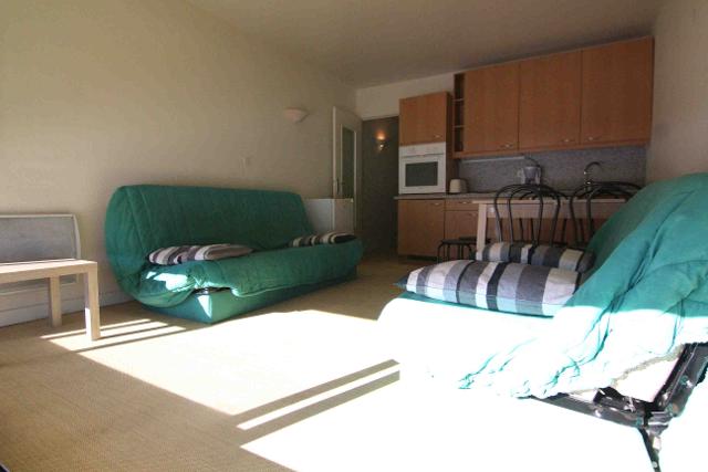 Il se compose d'un sejour avec un canape BZ pour 2 personnes et d'un clic clac et un coin nuit avec lit double. Coin cuisine equipe d'un lave vaisselle, de 4 plaques electriques, d'un four, d'une cafetiere electrique, d'un grille pain, d'un service a raclette et d'un four a micro ondes.