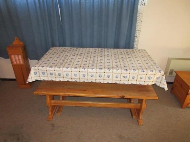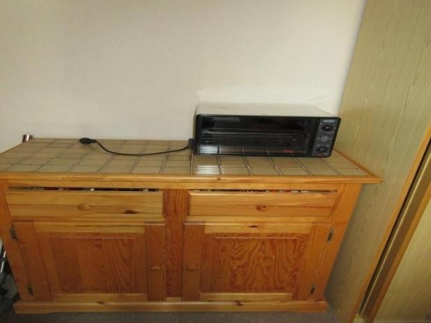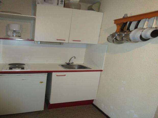 Equipée d'un réfrigérateur, de deux plaques électriques et d'un four.
