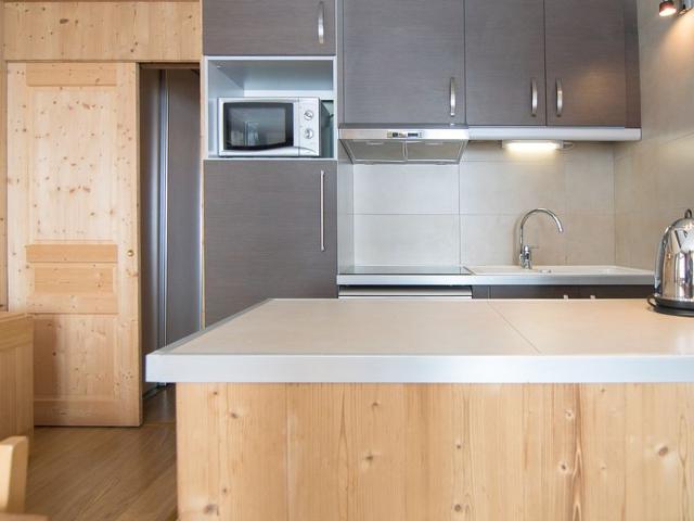 Cuisine : plaques vitrocéramiques, four, micro-ondes, réfrigérateur, lave-vaisselle et cafetière à filtre.