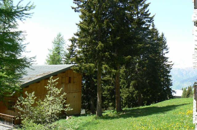 Grand balcon exposé plein Sud avec vue sur la vallée et les montagnes environnantes. Deuxième étage de l'immeuble (Accès Niveau -2). Consigne à skis.