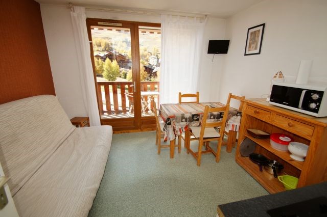 Studio au premier étage sans ascenseur, 2 lits simples superposés dans l’entrée, séparée du séjour par une porte. Salle de bains et toilettes séparées. Séjour avec canapé-lit, télévision, cuisine équipée.