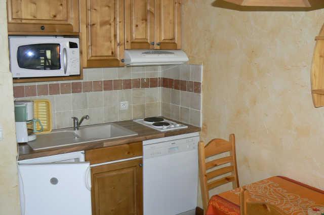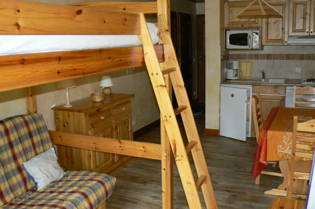Studio de standing de 24m², 4 personnes, séjour avec un canapé lit clic-clac 2 pers., et une mezzanine double, télévision, coin repas, kitchenette avec lave-vaisselle, plaques électriques et micro-ondes-grill.