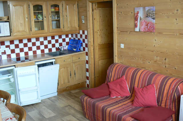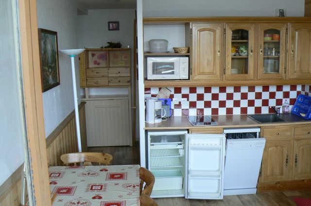 Appartement 2 pièces de 29 m², 4 personnes, comprenant une entrée avec un lit rabattable 1p, un séjour avec canapé-lit bz pour 2 pers. , télévision, coin repas, coin cuisine avec 2 plaques vitrocéramiques, micro-ondes, lave-vaisselle, réfrigérateur, une petite chambre séparée avec lit double de 140 x 200 et placard, une salle de bain avec douche, lavabo, wc séparé.