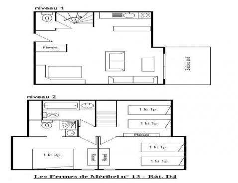 Situé à Méribel village à 2 km de la station. Appartement duplex 6 personnes, 3ème étage, ascenseur, balcon sud, casier à skis, parking couvert.