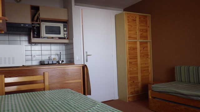 Agréable Studio 22 m² pour 4 personnes, avec à l'entrée 2 lits superposés, un séjour avec canapé gigogne, coin repas, télévision, kitchenette avec plaques électriques, four multi-fonctions, une salle de bain avec baignoire et wc séparé.