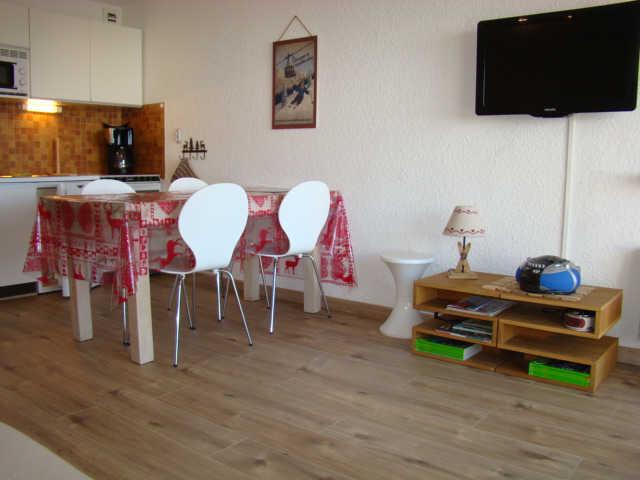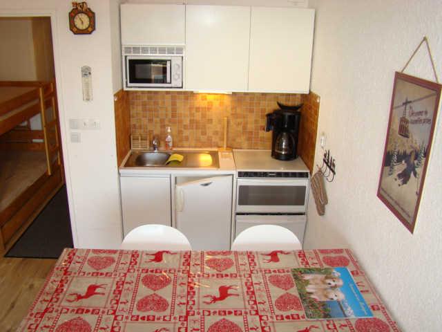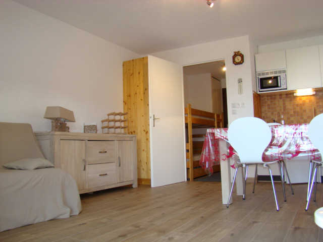 Studio centre station composé d'une entrée, coin montagne avec 2 lits superposés (2 couchages), SdE/wc, kitchenette ouverte sur séjour/salon disposant d'un canapé convertible 160 (2 couchages). balcon, casier à ski, proche des remontées mécaniques.