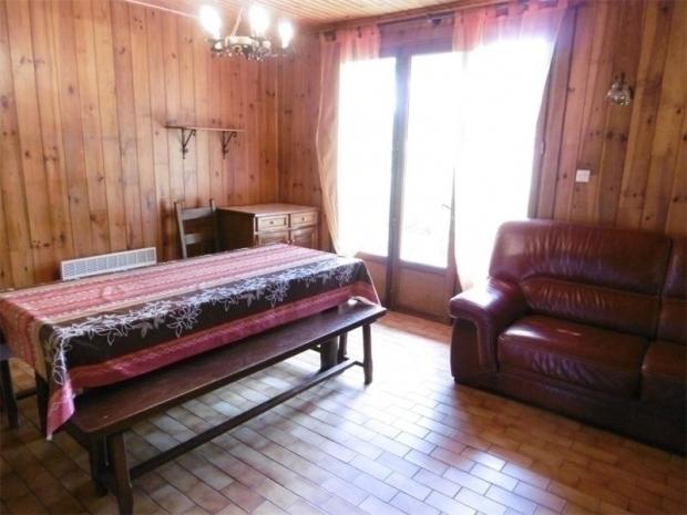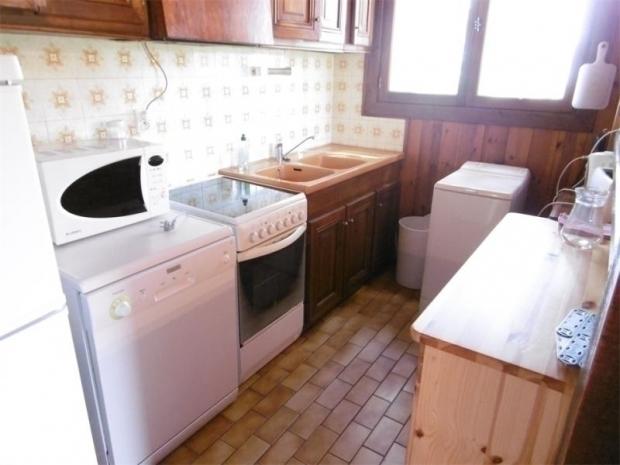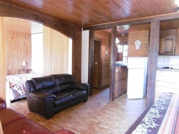 Bas de chalet de type F3 de 62 m² avec entrée (rangements), WC indépendants, salle d'eau, 2 chambres (lit en 140), séjour coin cuisine (réfrig., LV, LL, 4 plaques induction, four, micro-ondes), coin repas, coin salon (2 lits tiroirs en 90, TV), accès direct sur jardin boisé. Sol : carrelage