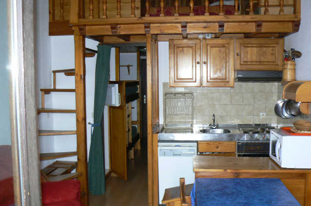 Spacieuse mezzanine ouverte sur séjour avec canapé, coin repas, télévision cuisine en bois équipée avec réfrigérateur combiné, four, micro-ondes, lave-vaisselle et plaques éléctriques. Balcon exposition Sud ave vue sur la vallée. Casier à skis et un box de stationnement en garage inclus (1,90 m de hauteur maxi). Bouquetins A