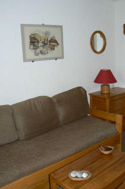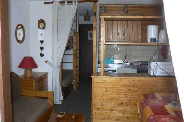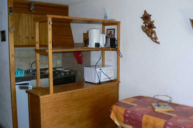 Studio coin montagne de 21m², 3/4 personnes, entrée avec 2 lits superposés, séjour avec 1 canapé lit clic-clac 2 pers. , télévision, kitchenette avec 4 plaques électriques, micro-ondes, four, une salle de bain avec baignoire et wc séparés.