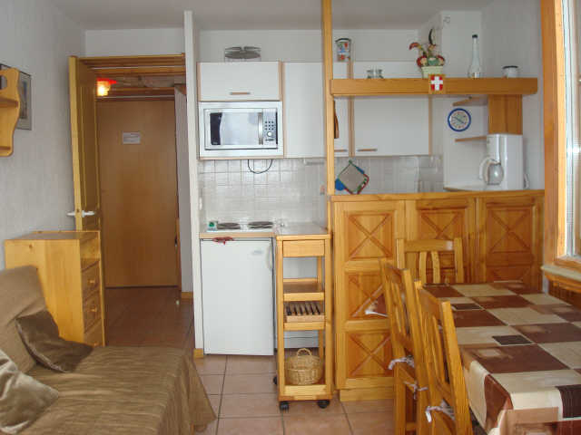 Appartement 2 pièces + alcove 30 m² pour 6 personnes, cabine fermée par rideau dans l'entrée avec 2 lits superposés, salle de bain avec baignoire et wc séparés ; Salon avec canapé lit 2 pers., télévision, lecteur DVD, coin repas et cuisine ouverte avec 4 plaques électriques, lave-vaisselle et micro-ondes. Une chambre parentale avec coin lavabo et accès balcon commun au séjour , exposé Sud avec vue dégagée sur la vallée.