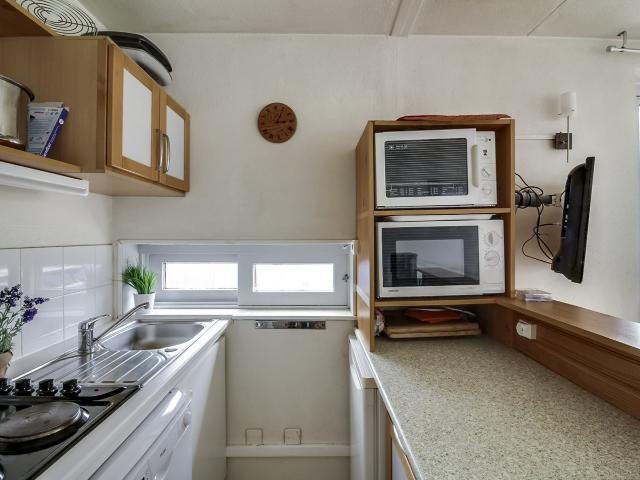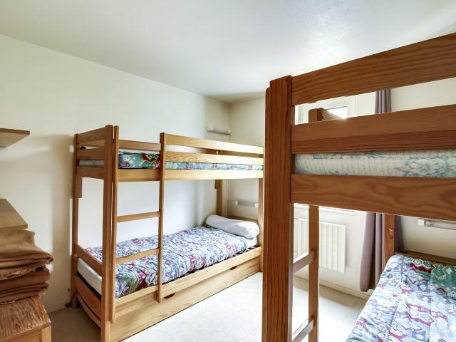 Appartement situé au 7ème étage, surface de 50 m² avec terrasse, exposition sud, face aux montagnes. Accès au Séjour par escalier intérieur, équipé d?un téléviseur, de 1 canapé lit clic clac, une chambre avec un lit en 140, une chambre avec 2 x 2 lits superposés. Kitchenette ouverte dans séjour avec plaques électriques, micro ondes, minifour, frigo 110 litres, cafetière à filtre, grille pain, bouilloire, lave vaisselle. Salle d'eau : douche, lavabo, Toilettes. Séparées. Pvc au sol. Casier à ski face à l?appartement. Animaux non autorisés.