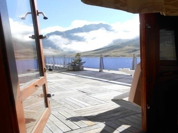 terrasse ouverte dans une résidence sur les pistes avec galerie commerciale sous l'immeuble offrant tous les commerces.