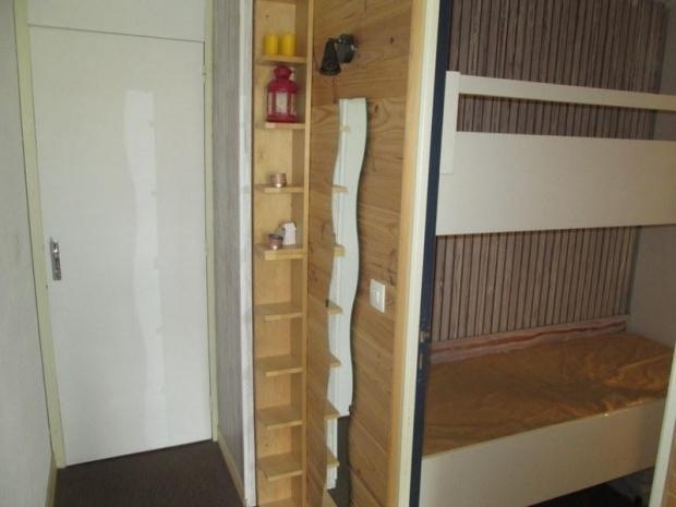 coin cuisine en entrée, salle de bains avec toilettes, séjour équipé de lits superposés et d'un canapé lit 2 places.
