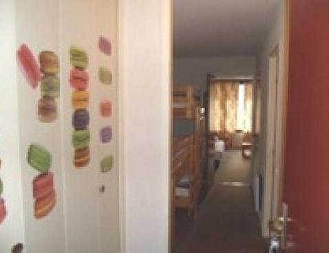 3 lits superposés en entrée, séjour avec canapé lit, salle de bains et toilettes séparées, coin cuisine.