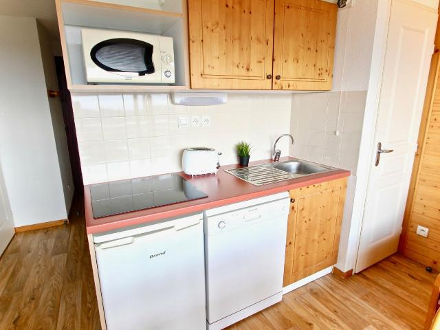 Equipée d'un réfrigérateur, de quatre plaques vitrocéramique, d'un micro-ondes, et d'un lave vaisselle.