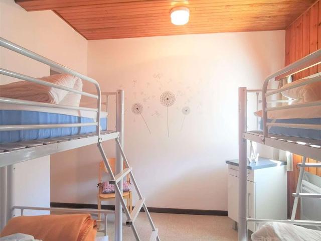 Maisonnette individuelle de 34 m² comprenant un séjour exposition Sud avec fenêtre donnant sur la station. Equipée d’un canapé lit deux places dans le séjour et d'une chambre avec deux fois deux lits superposés. Cuisine fermée avec coin repas : micro ondes, cafetière filtre, bouilloire, grille pain, four et lave vaisselle. Salle d’eau, toilettes séparées, dressing et casier à skis dans le chalet. Pas de balcon. Appartement non fumeur.