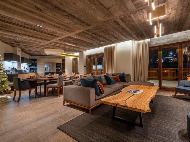 L'intérieur est pensé comme un refuge chic de montagne avec du bois rehaussé de matériaux contemporains tels le verre et l'acier. Le mobilier sélectionné par Nathalie de Breda fait appel à des accessoires, des revêtements muraux et des tissus principalement français et européens, le tout confectionné par des artisans locaux au savoir-faire irréprochable. Les espaces communs de plus de 400 m² rassemblent un ski room, une piscine, une salle de fitness, une salle de massage avec table de ressourcement à sable quartz et un hammam.