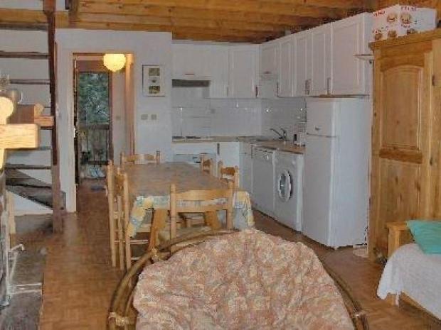 Chalet mitoyen 70 m ² avec balcon vue lac, accessible par 4 marches, avec entrée, salle d'eau/WC, séjour avec coin salon (insert cheminée, clic-clac,, TV), coin cuisine équipé (4 plaques, four, réfrigérateur, micro-ondes, lave-linge, lave-vaisselle, hotte), cabine fermée (2 lits superposés). Au 1er : chambre (1 lit 140 + 1 lit d'appoint), 1 chambre (2 lits 90), salle de bains/WC (lavabo, baignoire, WC).
