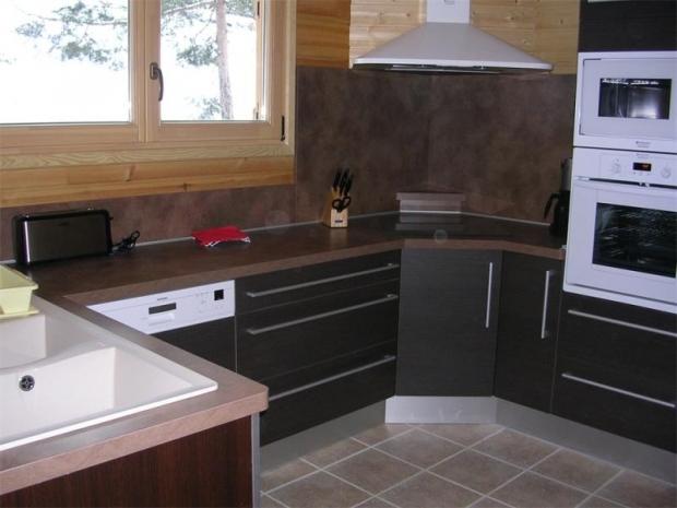 Cuisine équipée avec 4 plaques chauffantes, réfrigérateur, four + micro ondes.