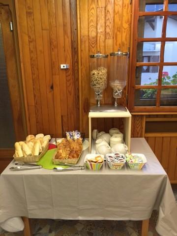 Buffets avec pain, croissants, pain de mie, tartes aux myrtilles de la région, confitures locales, céréales, jambon, fromage, yaourts nature et aux fruits, beurre, lait, chocolat, thé, café et jus de fruit.
