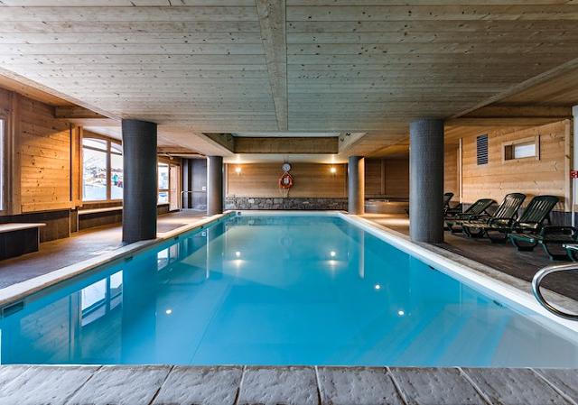 Résidence : Architecture traditionnelle savoyarde. 115 appartements entièrement équipés de prestations haut de gamme répartis sur 4 étages (avec ascenseur). Sur place : wifi dans les logements (payant), piscine couverte chauffée et bain à remous, sauna et hammam (2 séances de sauna ou hammam offertes/appartement/semaine), restaurant l’Élan.