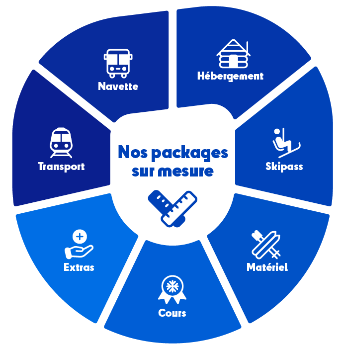 Nos packages sur mesure sont parfaits pour un séjour au ski tout compris. Sélectionnez le transport, le transfert, l'hébergement, les forfaits de remontées mécaniques - skipass-, la location du matériel de ski, les cours de ski et toutes les options extra ski les plus adaptées à vos vacances en bénéficiant des meilleurs tarifs négociés grâce à nos milliers de clients.