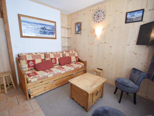 Petit 2 pièces 4/5pers, 27m2, en RDC (plain pied) (déneigement non garanti), orienté au sud, vue sur centre hameau, sans ascenseur Entrée 1 - Cuisine : 2 plaques vitro-céramiques.,four multi-fonctions, cafetière électrique, réfrigérateur, lave-vaisselle. Séjour : coin repas, 2 lits gigognes, TV - Chambre : 2 lits jumeaux 80x190cm (formant un lit double 160cm) + 1 lit superposé 1 pers 80x190cm - SDB : baignoire et WC séparés - Literie : 2 couettes 2p et 2 couvertures 2p, 1 couette 1p et 2 couvertures 1p - Ménage de fin de séjour, draps, serviettes et forfaits ski en option. Casier à skis N°10 au RDC - Appartement rénové, très agréable. ANIMAUX NON-ADMIS -