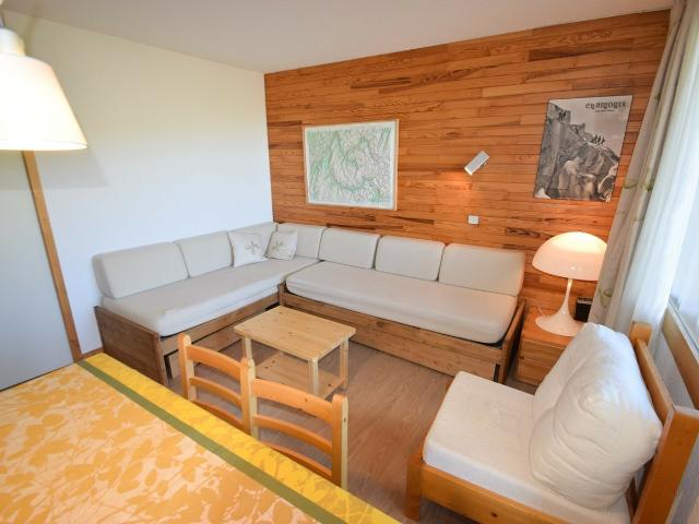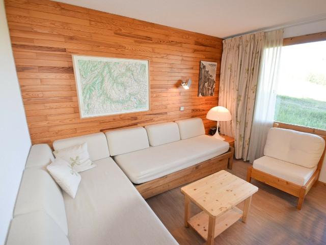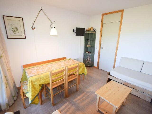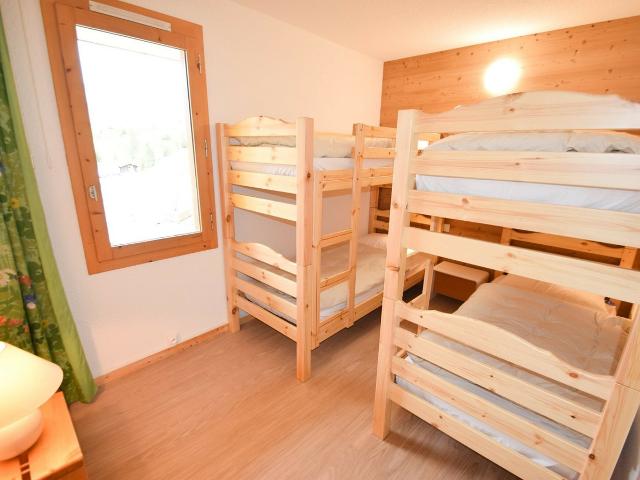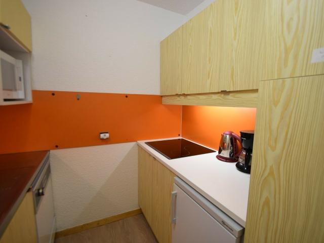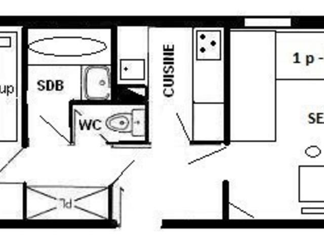 Appt 2 pièces 5 pers, env 35 m2, exposition Sud/Ouest, de plain-pied avec petite terrasse (déneigement non garanti), accès direct et vue sur les pistes, RDC - Entrée 2 - Cuisine: 4 plaques vitrocéramiques, four multi-fonctions, réfrigérateur, Lave-vaisselle - Séjour : coin repas, 1 banquette-lit 1 pers (80cm)- Télévision - Chambre : 2 x 2 lits superposés (80cm) - SDB : baignoire, WC séparés. Les sols: plastique - Literie : couettes - Ménage de fin de séjour, draps, serviettes et forfaits ski en option. ANIMAUX NON ADMIS. Casier à skis n°21 au RDC.