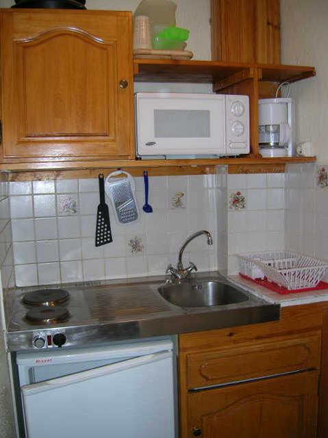 Coin cuisine avec 2 plaques electriques, refrigerateur et four micro ondes.