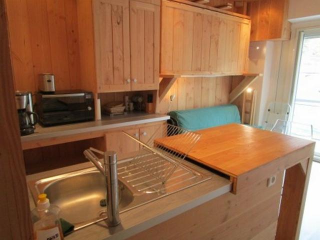 Studette située au 1er étage (accès par escalier et ascenseur) 15 m² en exposition Sud avec balcon, comprenant un séjour avec canapé lit et un lit en hauteur en 90, téléviseur, une salle de douche avec toilettes. Kitchenette équipée micro ondes, 2 plaques induction, combi four micro ondes, lave vaisselle, cafetière électrique, réfrigérateur. Parquet au sol.