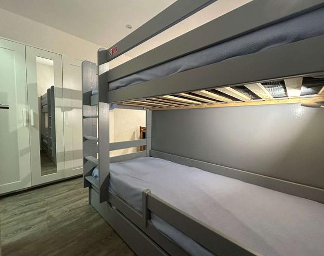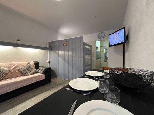La pièce principale dispose d'un canapé convertible en 140x190 avec TV, une cloison en bois sépare le coin nuit agencé de lits superposés en 80x190.