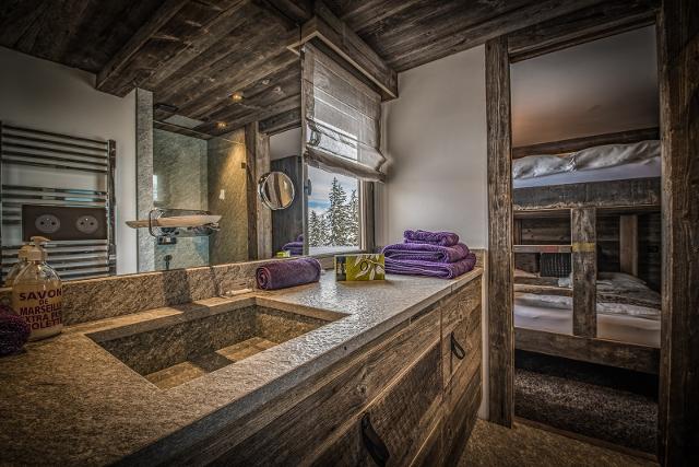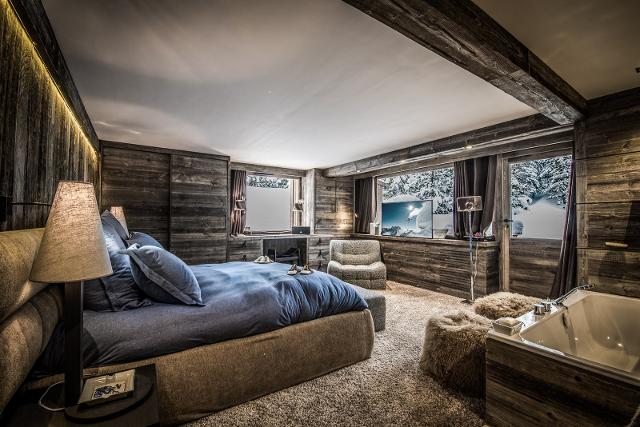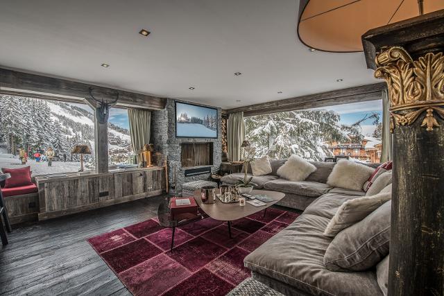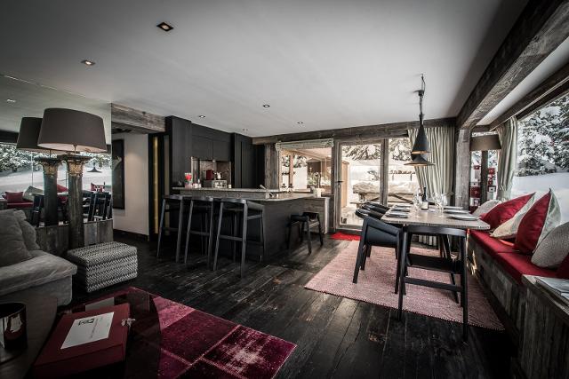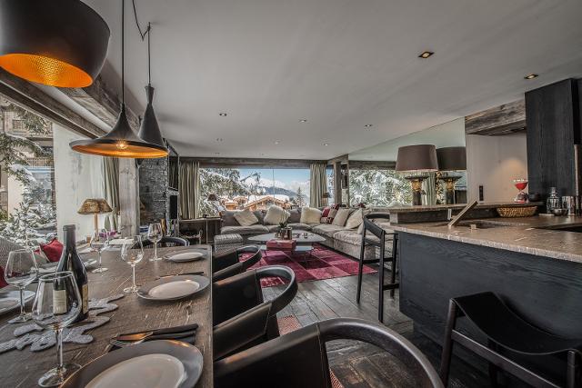 Une pièce de vie avec une cuisine ouverte, un salon avec cheminée, salle à manger, terrasse sur la piste du Bellecôte