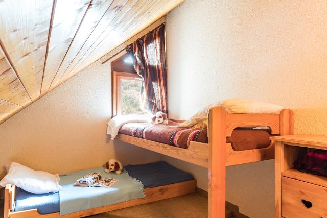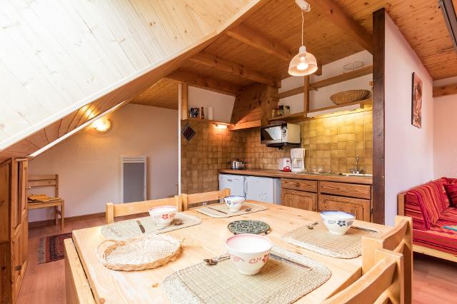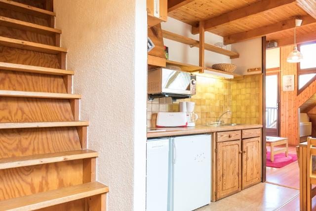 Ce studio de vacances se compose : d'une première chambre avec un lit gigogne pour deux personnes, d'une seconde chambre avec des lits superposés (2 lits simples) à l'étage, d'un séjour avec canapé-lit pour deux personnes, d'un coin cuisine équipé (lave-vaisselle, micro-ondes, four, plaques électriques...) et ouvert sur le coin repas, d'une salle de bain et d'un wc indépendant.