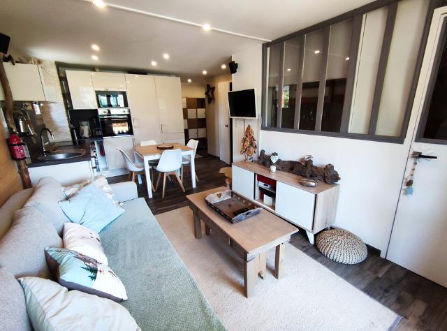 Superbe appartement 2 pièces de 35 m² avec balcon sud ouest de 4.6 m², comprenant une entrée avec rangements, une salle d'eau, WC séparés, 1 chambre avec lit double, coin nuit avec 2 lits superposés en 120 de large, une kitchenette, un séjour.