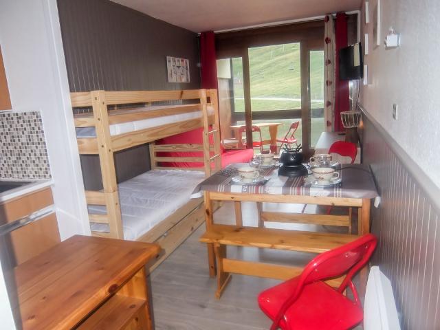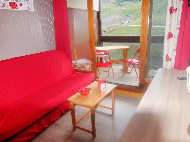Studio 23 m2 au 6ème étage, situation sud. Aménagement agréable: séjour/chambre à coucher avec 1 divan-lit double et 1 x 2 lits superposés (90 cm, longueur 190 cm), TV (écran plat). Coin cuisine (four, four micro-ondes, cafetière électrique). Bain/WC. Sol en parquet. Balcon. Très belle vue sur les montagnes et les pistes de ski. A disposition: Internet (Connexion WIFI, en sus). Veuillez noter: logement pour non fumeurs. Détecteur de fumée.