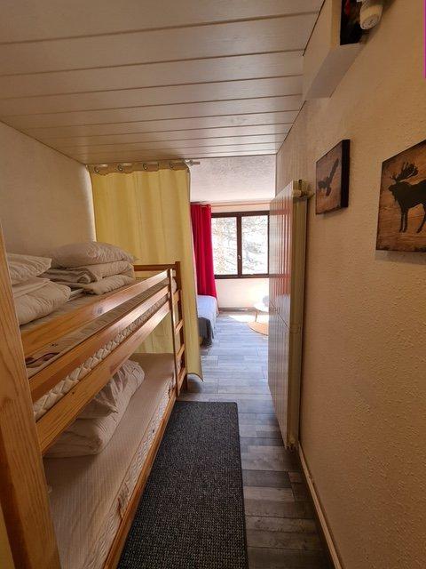 Composé d'un coin montagne ouvert avec deux lits superposés, 1 coin séjour salle à manger avec canapé lit, cuisine neuve toute équipée ouverte sur séjour, et une salle d'eau avec meuble vasque et cabine de douche