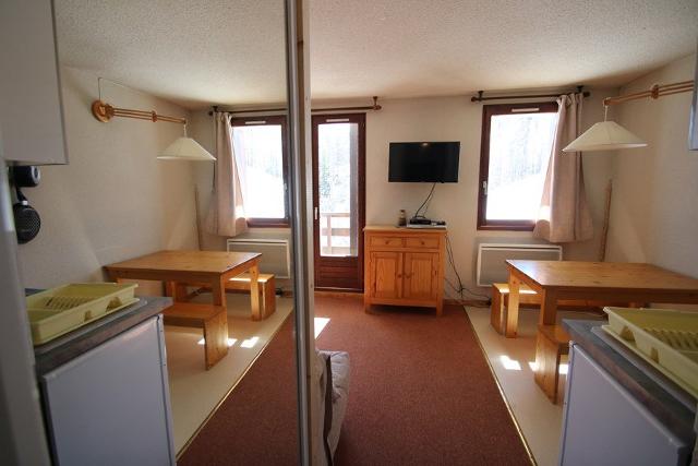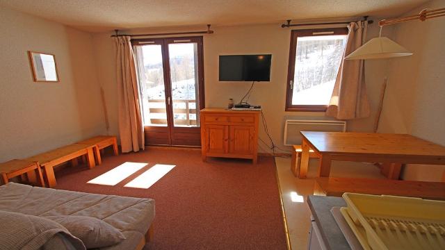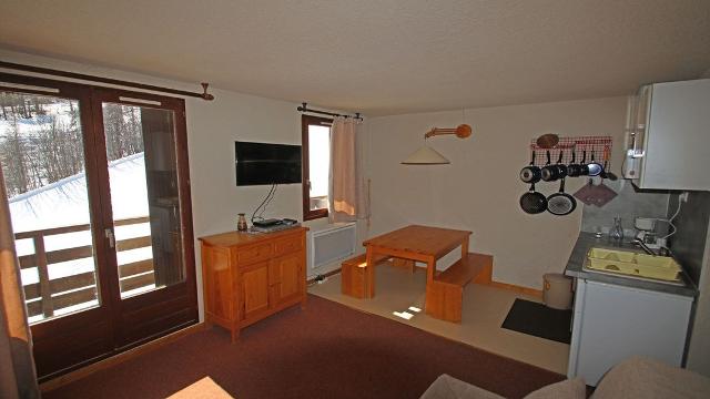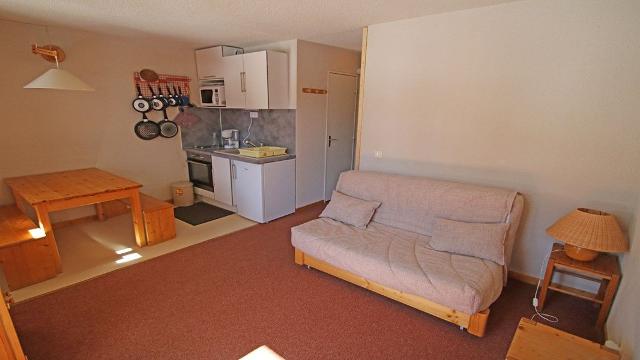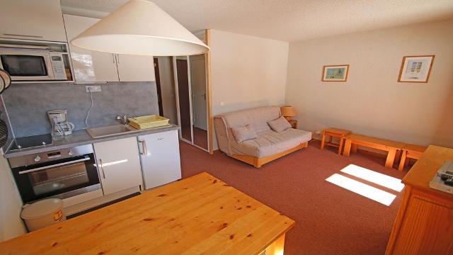 - Dans le séjour, un coin cuisine équipé avec four et micro-onde, le coin repas et la banquette gigogne. Balcon en exposition sud, sur les pistes.