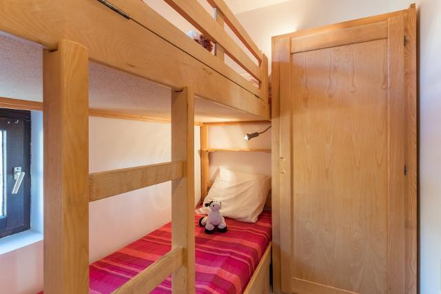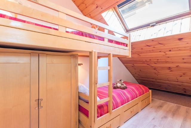 une première chambre avec lit double en 140, une deuxième chambre avec lits superposés en 80, en sous pente avec vélux et une petite salle de bain.