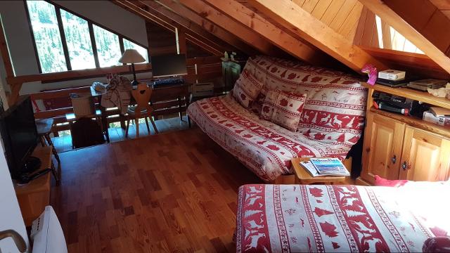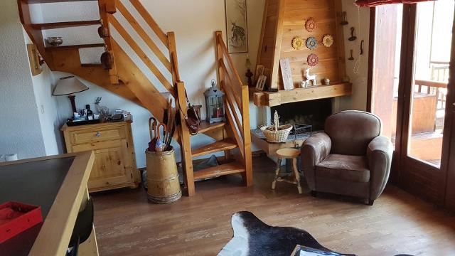 - le salon avec une cheminé et une très belle vue sur les montagnes et le pistes ;