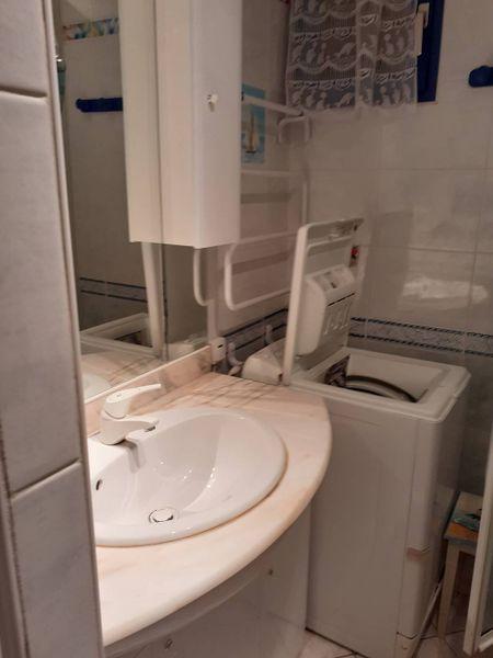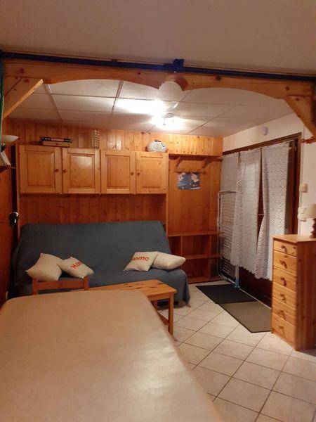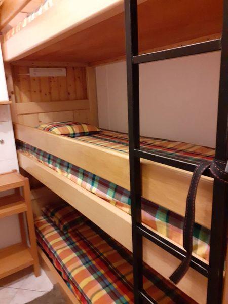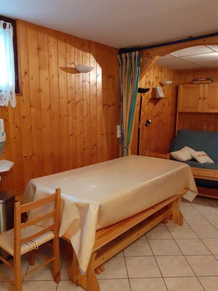 Appartement 6 couchages dans petite copropriété, comprenant : une entrée, un séjour avec canapé clic clac, un coin cuisine équipée, une salle de douche avec 1 lave linge, un WC, une chambre avec un lit double et coin montagne avec 3 lits simples superposés.