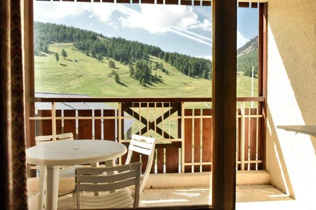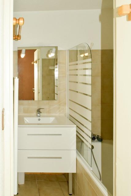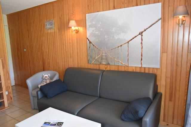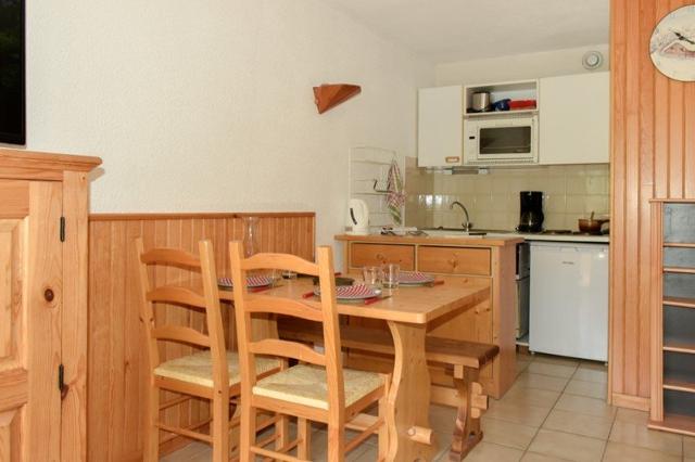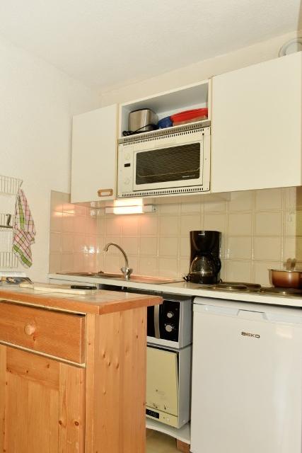 Il est composé d'une entrée pour vous déchausser, d'un coin montagne avec des lits superposés rabatables, d'une salle de bains avec baignoire, d'un wc séparé, d'un salon avec canapé convertible pour 2 personnes et télévision donnant sur un balcon plein sud d'où vous pourrez profiter du panorama. La cuisine est équipée de plaques électriques, d'un mini lave-vaisselle, d'un micro-ondes, d'un mini-four et d'un frigidaire top.