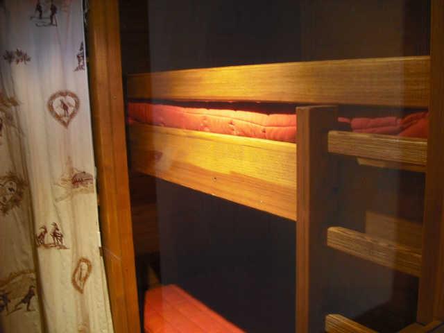 Coin montagne fermé par un rideaux avec 2 lits superposés.