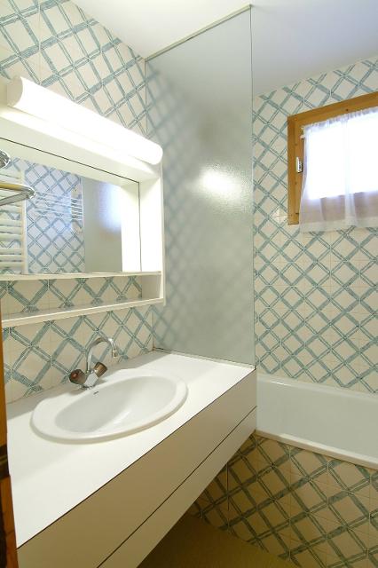 - Salle de bain avec baignoire, sèche-cheveux et sèche-serviettes,