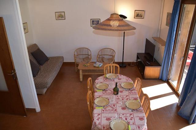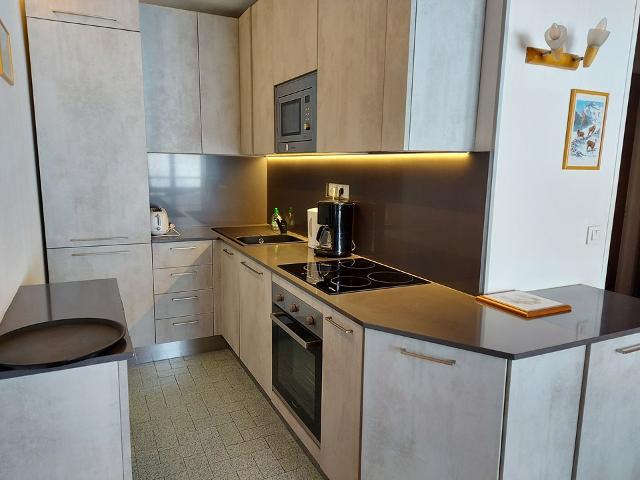 L'appartement est composé d'une entrée avec un placard dans lequel vous pourrez laisser manteaux et après-skis ; d'une salle de bain avec baignoire, lave-linge et sèche cheveux ; d'un wc séparé, d'un grand séjour avec un canapé convertible en 180 cm, une télévision, 2 fauteuils, 2 tables pour manger donnant sur un balcon plein sud d'où vous pourrez profiter de la vue et du soleil.