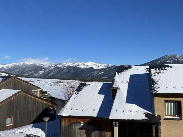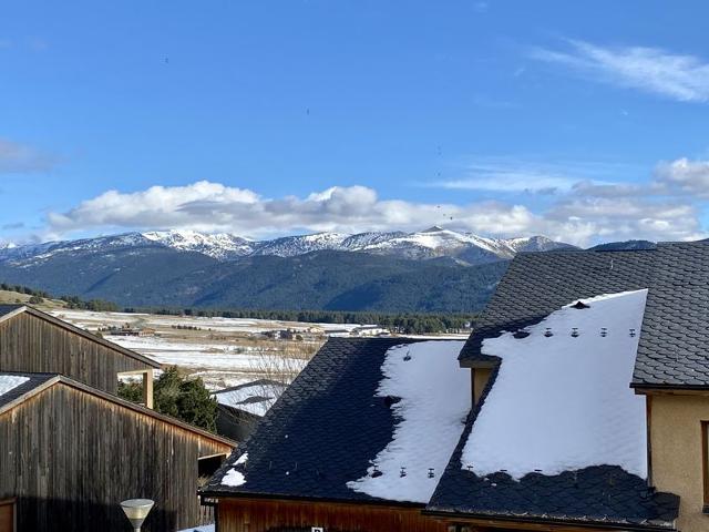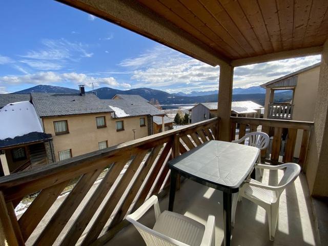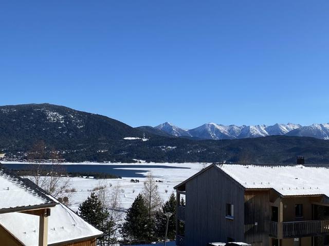 Séjour ouvert sur un grand balcon avec une vue sur le Lac de Matemale et la chaîne de montagnes.