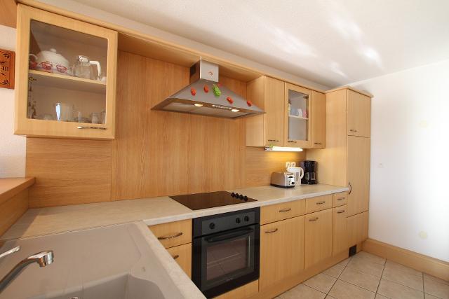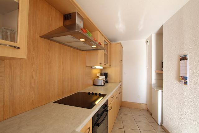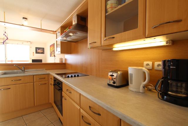 Il dispose d'une cuisine ouverte sur le séjour, bien équipée (four, réfrigérateur, micro-ondes, plaques vitrocéramiques, hotte aspirante, bouilloire...), d'un salon-séjour donnant accès à la terrasse.