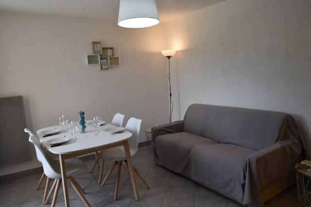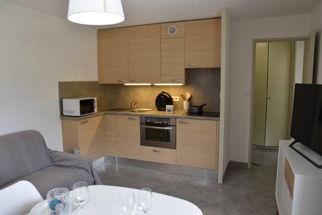 Il est composé d'une entrée avec des rangements ; une chambre avec 4 couchages réparti comme suit : un lit en 160 cm et des lits superposés en 90 cm ; une salle d'eau avec fenêtre; wc séparé ; et un grand séjour exposition ouest avec un canapé convertible, une télévision, WIFI, balcon. Une cuisine équipée de plaques vitrocéramiques, un four, un micro-ondes, grille-pain, bouilloire, cafetière Dolce Gusto, appareil à fondue et raclette, cocotte minute.